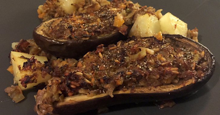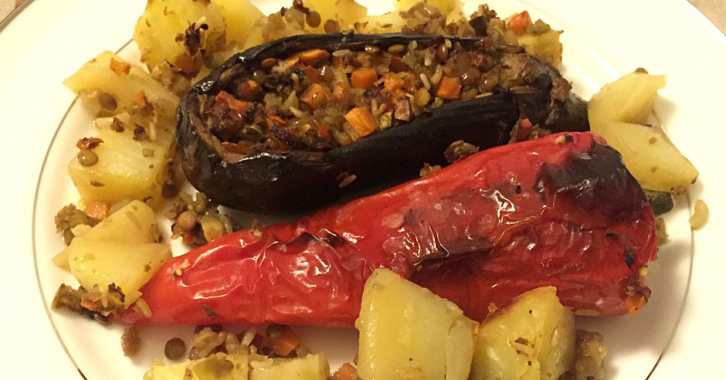 Όταν έχεις 4 μελιτζάνες και λίγα βασικά λαχανικά, μερικές φορές το να επιλέξεις την κλασσική λύση “ψητά λαχανικά – ε! και λίγο ρυζάκι από κοντά”, μπορεί να σου φαίνεται λιγάκι βαρετό. Ο αυτοσχεδιασμός όμως είναι το παν!