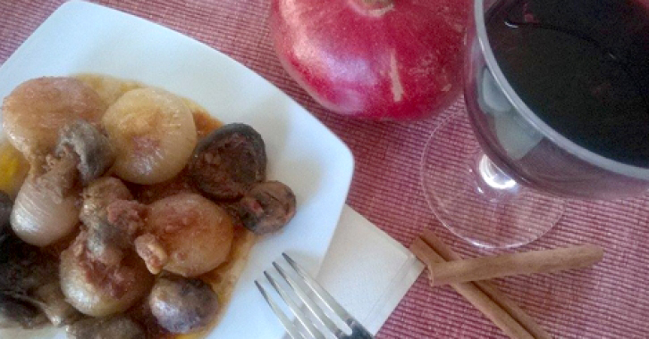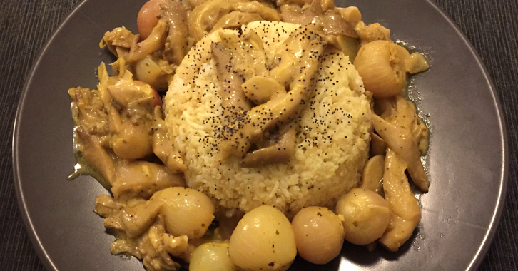 Ένα ιδιαίτερο στιφάδο, λεμονάτο, με την κινόα και το ρύζι να συνδυάζονται υπέροχα με τα μελωμένα κοκκάρια, τα μανιτάρια και τη μουστάρδα.