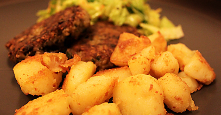 Μελιτζανομπιφτέκια και πατάτες βραστοτηγανητές