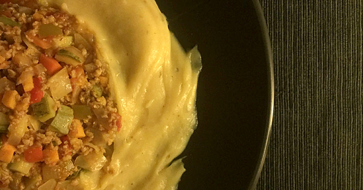 Η πατάτα, σε μορφή πουρέ, είναι από τις αγαπημένες μας μαλακές και ευγενικές τροφές! Δοκιμάσαμε να τον συνδυάσουμε με μια “πυκνή” σάλτσα από κιμά σόγιας και λαχανικά.