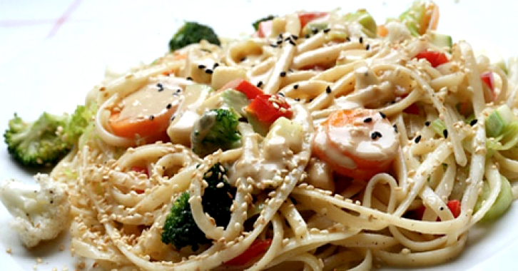 Σπαγγέτι με λαχανικά, σησάμι και ταχίνι
