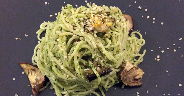 Σπαγγέτι με μελιτζάνες και με pesto kale και φρέσκιας ρίγανης